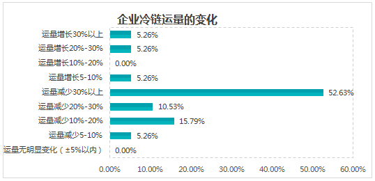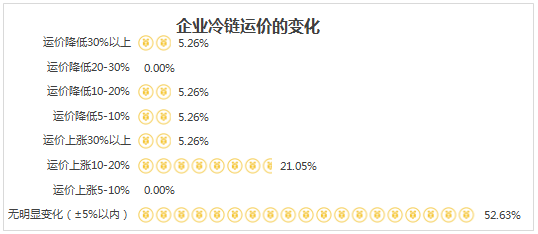 在調研中發現,受疫情影響,大多數企業冷鏈運量都出現了下降,52.63%的企業表示運量減少30%以上,15.79%的企業運量減少10%-20%。在運價方面,52.63%的企業反映運價無明顯變化,21.05%的企業表示運價上漲10-20%。