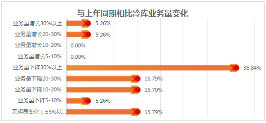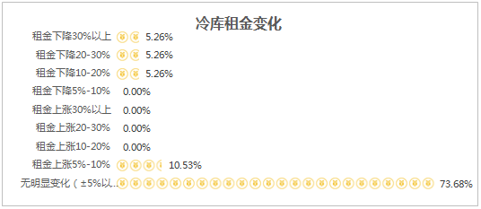 調研中,與上年同期相比,超過70%的企業出現了冷庫業務量下降,36.84%的企業冷庫業務量下降30%以上。在冷庫租金方面,73.68%的企業表示無明顯變化,10.53%的企業反映冷庫租金上漲5%-10%,15.78%的企業冷庫租金有不同程度的下降。