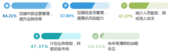 在疫情背景下,84.21%的企業選擇加強內部運營管理,提升運轉效率;57.89%的企業表示要加強現金流管理,提升抗風險能力;也有少部分企業尚未形成清晰的戰略意見。
