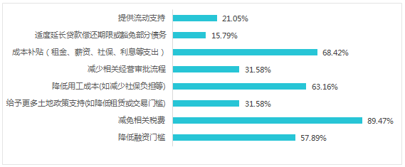 在疫情影響下,冷鏈企業希望政府方面能給予的政策支持有減免稅費、進行成本補貼(租金、薪資、社保、利息等支出)、降低用工成本(如減少社保負擔等)、降低融資門檻等等。