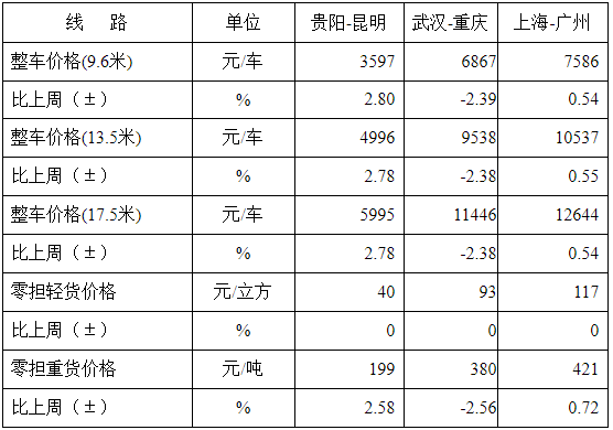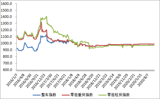 分車型看,各車型指數環比漲跌互現。其中,整車指數為990.36點,比上周回升0.13%;零擔輕貨指數為968.82點,與上周基本持平;零擔重貨指數為990.29點,比上周回升0.13%。