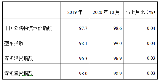 表1 2020年10月中國(guó)公路物流運(yùn)價(jià)指數(shù)表