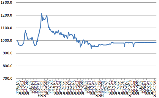 圖1 2016-2020年各周中國(guó)公路物流運(yùn)價(jià)指數(shù)