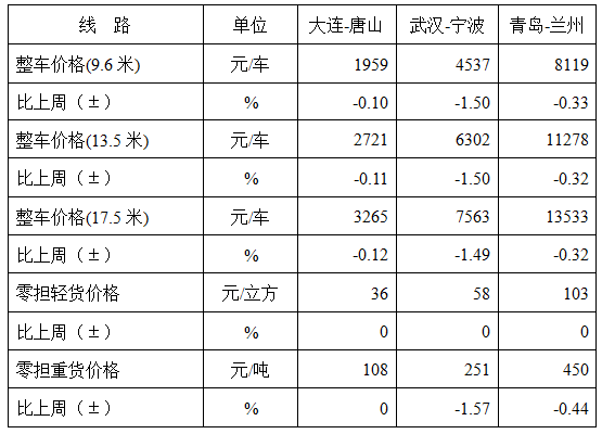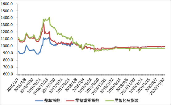 分車型看,各車型指數(shù)環(huán)比均有所回落。其中,整車指數(shù)為990.82點(diǎn),比上周回落0.08%;零擔(dān)輕貨指數(shù)為968.77點(diǎn),比上周回落0.01%;零擔(dān)重貨指數(shù)為988.88點(diǎn),比上周回落0.09%。
