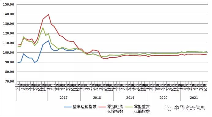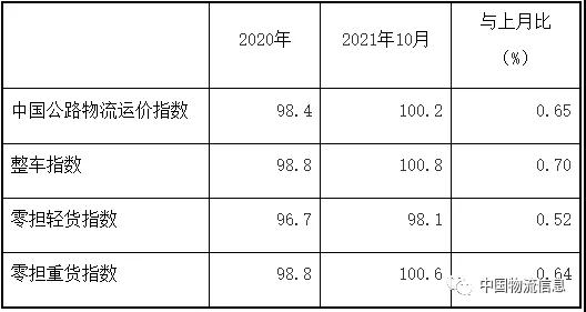 2021年10月份,由中國物流與采購聯合會和林安物流集團聯合調查的中國公路物流運價指數為100.2點,比上月回升0.65%,比去年同期增長1.7%。從各周指數看,第一至五周運價指數均有所回升。