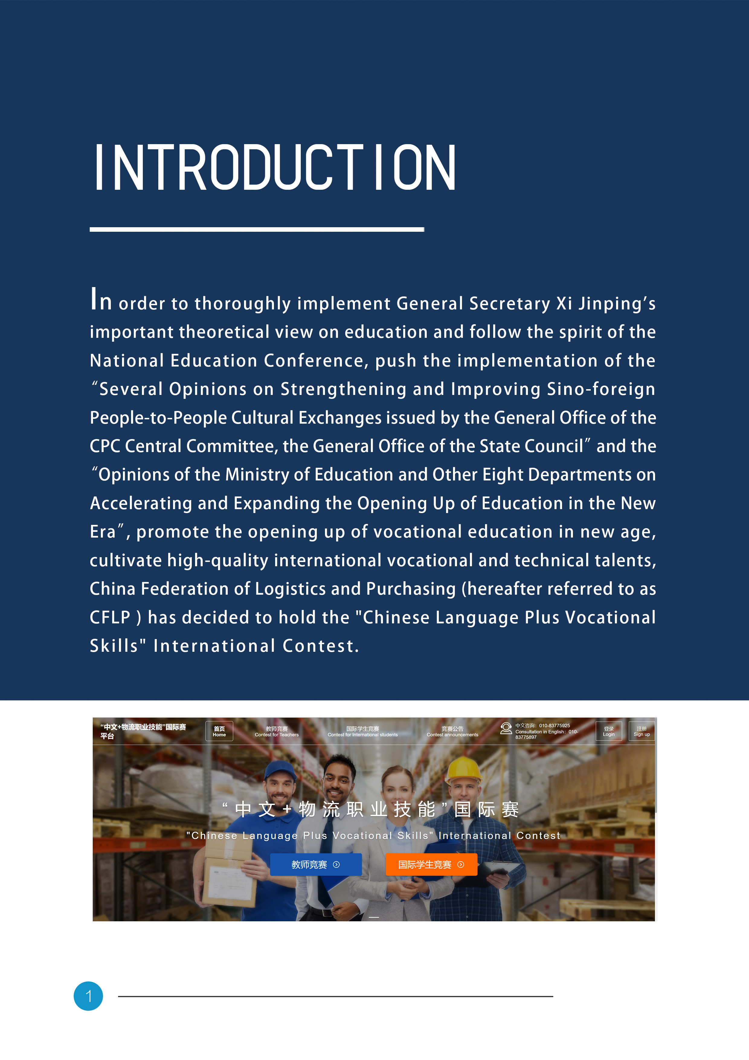 In order to thoroughly implement General Secretary Xi Jinping's important theoretical view on education and follow the spirit of the National Education Conference, push the implementation of the “Several Opinions on Strengthening and Improving Sino-foreign People-to-People Cultural Exchanges issued by the General Office of the CPC Central Committee, the General Office of the State Council” and the “Opinions of the Ministry of Education and Other Eight Departments on Accelerating and Expanding the Opening Up of Education in the New Era”, promote the opening up of vocational education in new age, cultivate high-quality international vocational and technical talents, China Federation of Logistics and Purchasing (hereafter referred to as CFLP ) has decided to hold the "Chinese Language Plus Vocational Skills" International Contest.