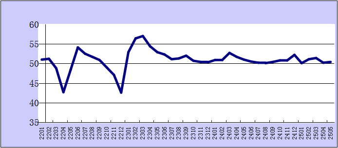 其中,2025年5月份,制造業生產指數為50.7%,較上月上升0.9個百分點;非制造業商務活動指數為50.3%,較上月下降0.1個百分點。