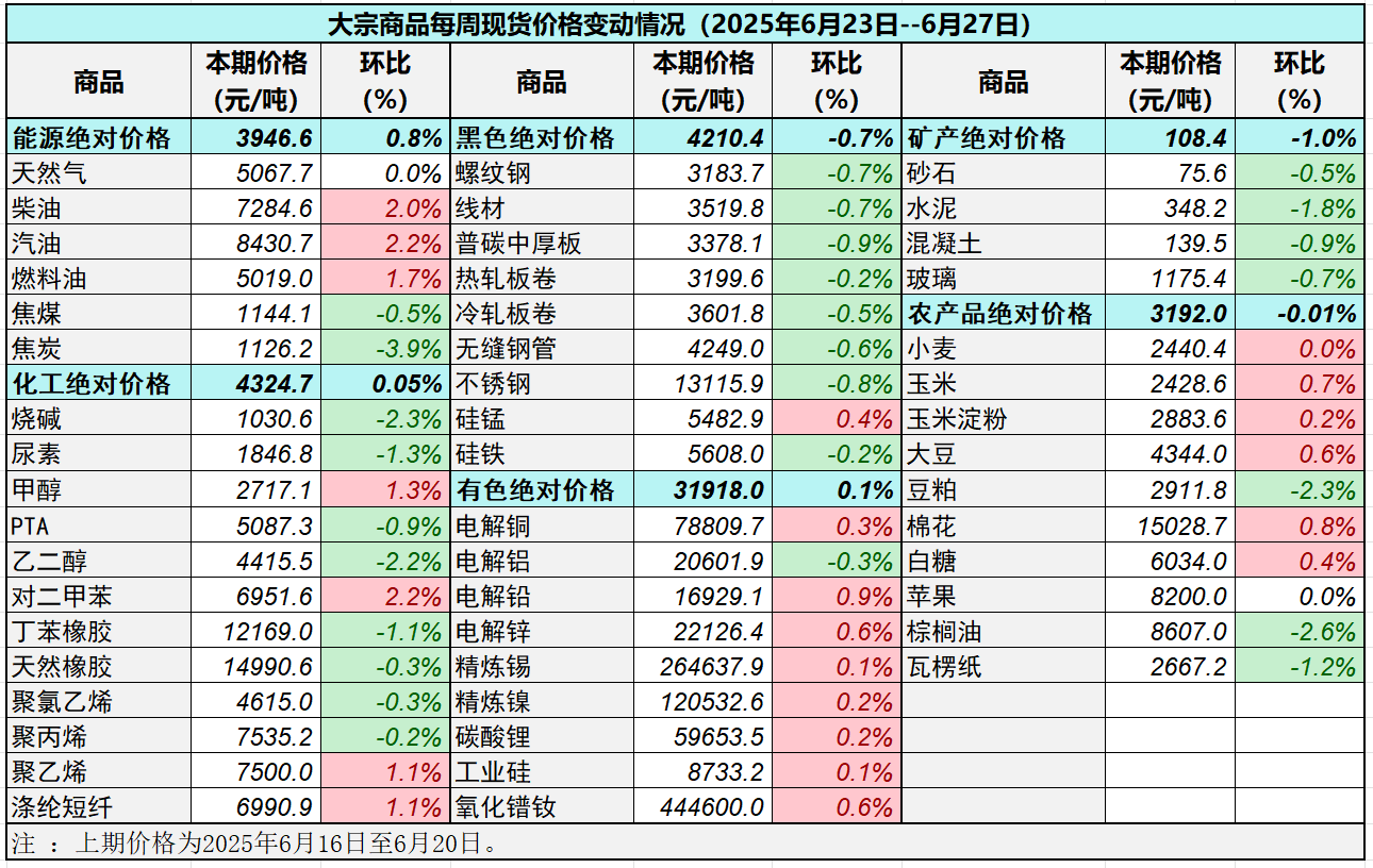 據中國物流與采購聯(lián)合會對全國50種重要大宗商品市場價格調查顯示,本期價格(2025年6月23日至6月27日)與上期價格相比,22種(占比44%)價格上漲,26種(占比52%)大宗商品價格下跌,2種(占比4%)價格持平。
