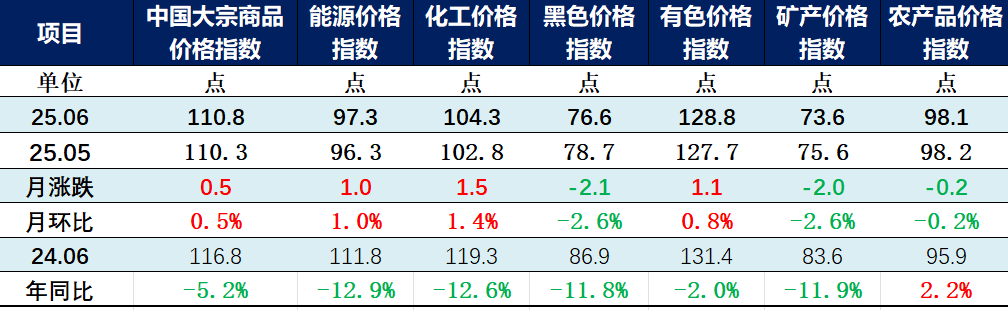 由中物聯(lián)大宗商品流通分會和上海鋼聯(lián)等單位聯(lián)合調(diào)查,中國物流與采購聯(lián)合會發(fā)布的2025年6月份中國大宗商品價格指數(shù)(CBPI)為110.8點,環(huán)比上漲0.5%,同比下跌5.2%。從指數(shù)運行情況來看,隨中美倫敦經(jīng)貿(mào)會談再次釋放積極信號,企業(yè)生產(chǎn)經(jīng)營活動繼續(xù)回暖,指數(shù)連續(xù)兩月溫和回升,表明二季度大宗商品市場總體穩(wěn)定,呈穩(wěn)中有進發(fā)展態(tài)勢。但當(dāng)前外部不確定、不穩(wěn)定風(fēng)險較多,部分行業(yè)有效需求不足、低價無序競爭等問題仍有待破解,鞏固增強經(jīng)濟回穩(wěn)向好基礎(chǔ),需加大宏觀經(jīng)濟政策逆周期調(diào)節(jié)力度,進一步發(fā)揮大宗商品流通業(yè)擴內(nèi)需、穩(wěn)增長、促發(fā)展重要作用。