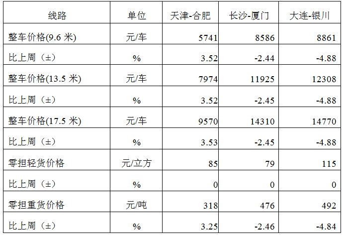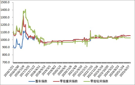 分車型看,各車型指數環比穩中有升。其中,整車指數為1055.80點,與上周基本持平;零擔輕貨指數為1025.76點,與上周基本持平;零擔重貨指數為1057.65點,比上周回升0.14%。