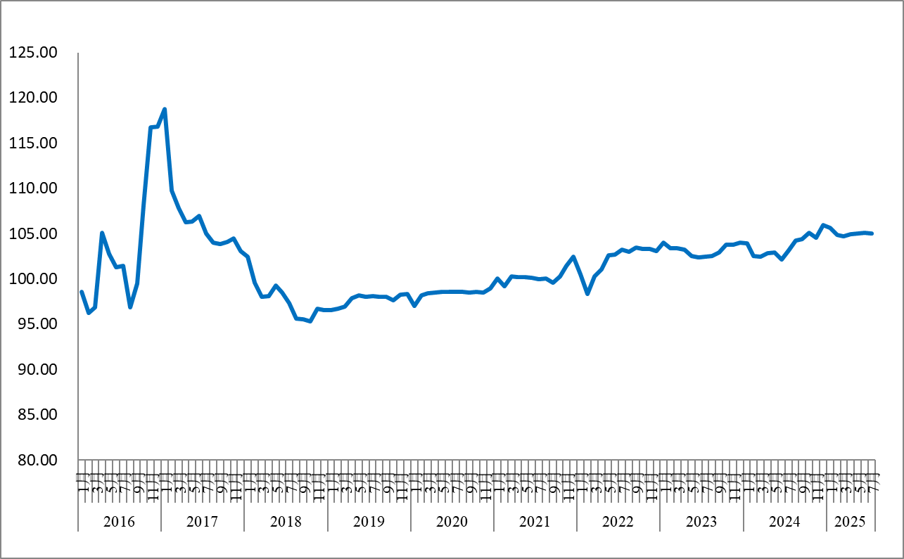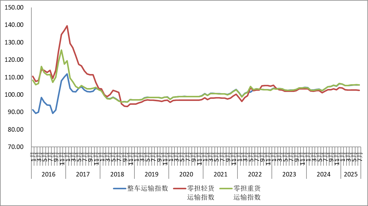 2025年7月份,由中國物流與采購聯合會和林安物流集團聯合調查的中國公路物流運價指數為105點,環比回落0.05%,同比去年回升1.8%。從月內看,第一、二、三周運價指數環比略微回落,第四周運價指數略有回升。