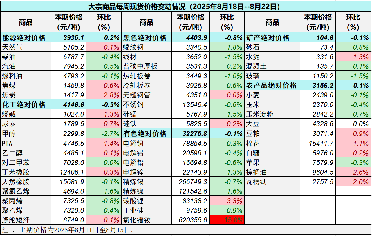 據中國物流與采購聯合會對全國50種重要大宗商品市場價格調查顯示,本期價格(2025年8月18日至8月22日)與上期價格相比,19種(占比38%)大宗商品價格上漲, 30種(占比60%)價格下跌, 1種(占比2%)價格持平。