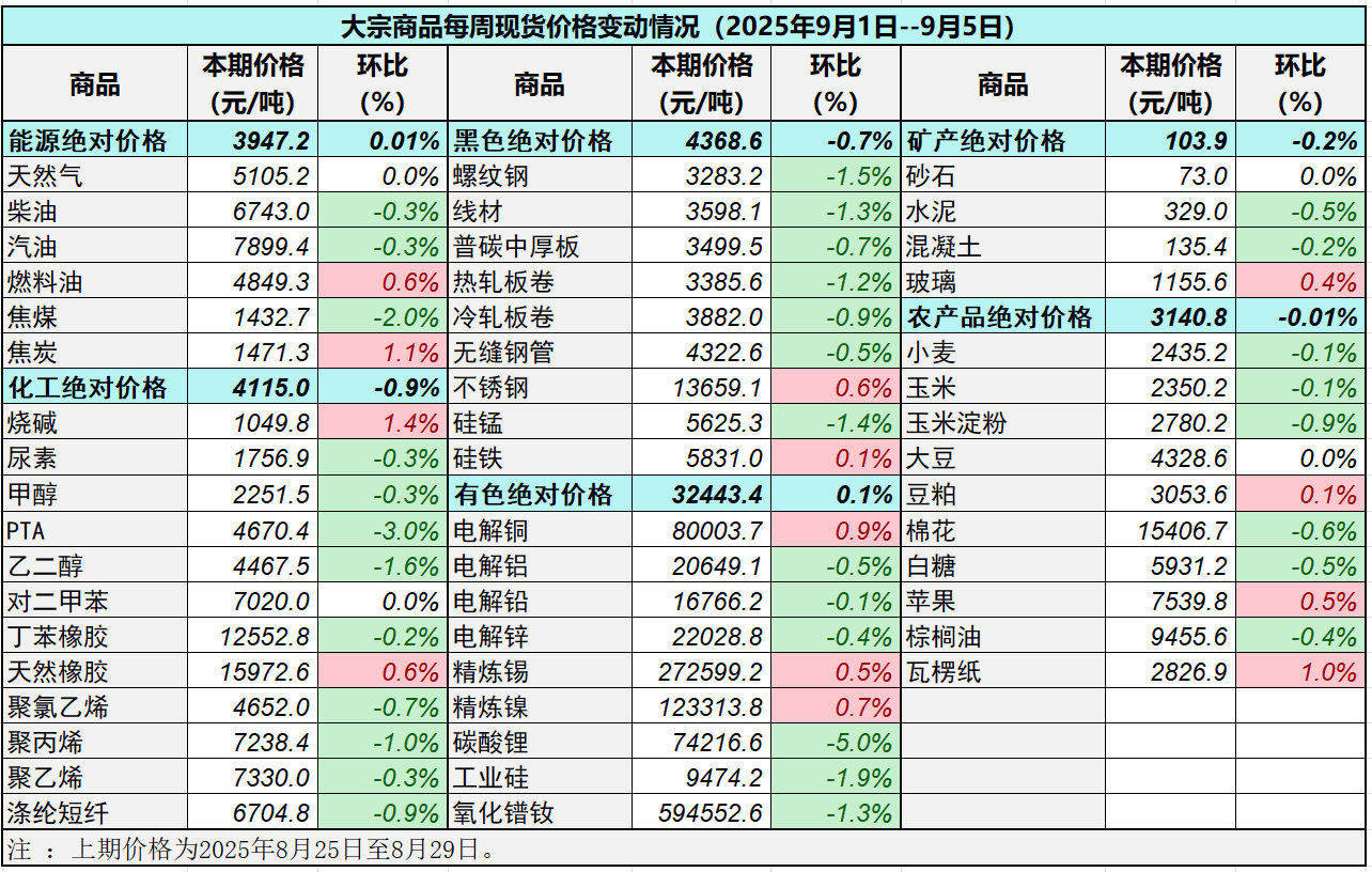 據中國物流與采購聯合會對全國50種重要大宗商品市場價格調查顯示,本期價格(2025年9月1日至9月5日)與上期價格相比,,13種(占比26%)大宗商品價格上漲, 33種(占比66%)價格下跌, 4種(占比8%)價格持平。