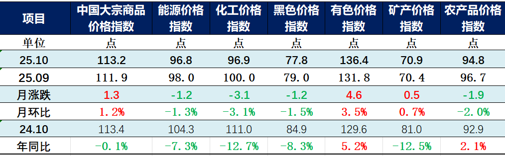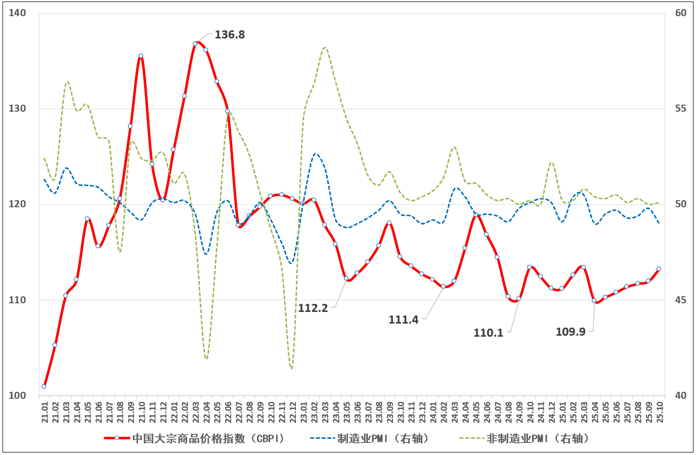 由中物聯大宗商品流通分會和上海鋼聯等單位聯合調查,中國物流與采購聯合會發布的2025年10月份中國大宗商品價格指數(CBPI)為113.2點,環比上漲1.2%,同比下跌0.1%。從指數運行情況來看,指數連續六個月環比回升,且漲幅有所擴大,表明隨國家反內卷、穩增長等政策效能持續釋放,高技術制造業、裝備制造業和消費品行業繼續保持快速增長,以及中美吉隆坡談判釋放積極信號,美聯儲再次降息等有利因素不斷增多,企業信心進一步增強,大宗商品市場景氣水平繼續回升。但全球經濟不確定因素仍然較多,部分行業大宗商品價格長期低位運行,供需矛盾仍比較突出,鞏固經濟回升向好態勢,仍需加大宏觀經濟調節力度,推動大宗商品流通提質增效降本,進一步釋放內需潛力。