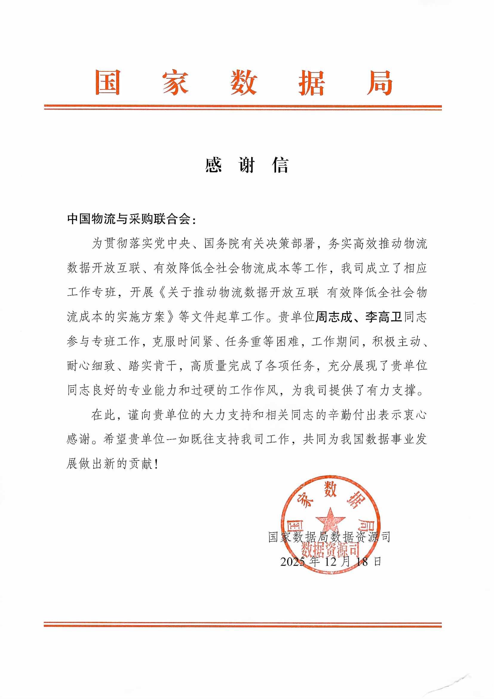 - 國家數(shù)據(jù)局?jǐn)?shù)據(jù)資源司致信感謝中物聯(lián)