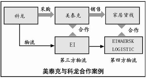 以美泰克與科龍的合作為例,美泰克在科龍采購冰箱銷售到北美的連鎖店家居貨棧,EI是美泰克的全球物流合作伙伴,MAERSK LOGISTIC 是家居貨棧的物流合作伙伴,遠東至北美的門到門服務均是由第三方物流EI和第四方物流MAERSK LOGISTIC 完成。