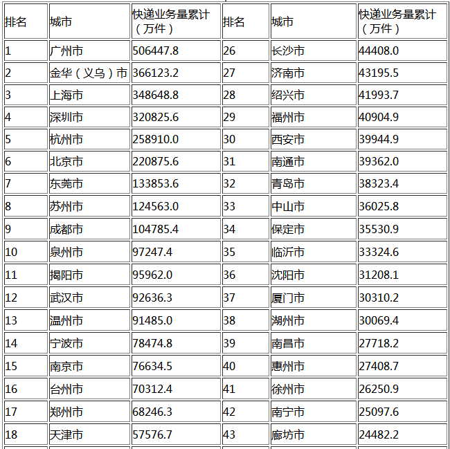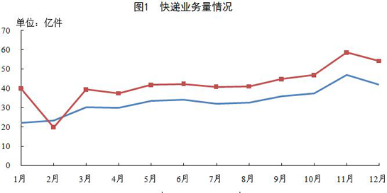 12月份,全國快遞服務企業業務量完成54.2億件,同比增長29%;業務收入完成609.6億元,同比增長17.3%。