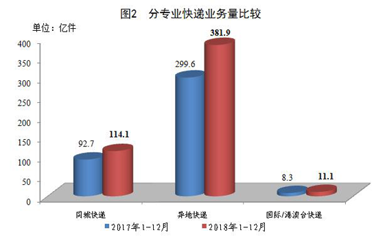 2018年,全國快遞服務企業業務量累計完成507.1億件,同比增長26.6%;業務收入累計完成6038.4億元,同比增長21.8%。其中,同城業務量累計完成114.1億件,同比增長23.1%;異地業務量累計完成381.9億件,同比增長27.5%;國際/港澳臺業務量累計完成11.1億件,同比增長34%。