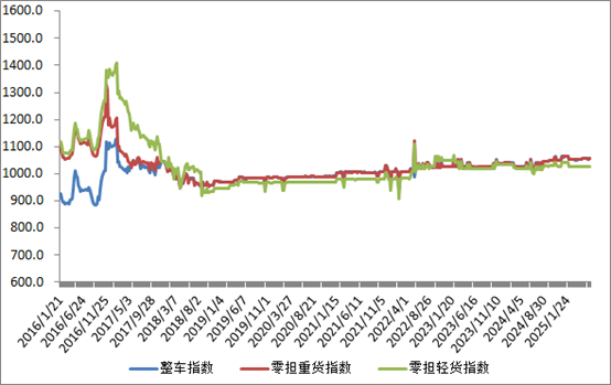 分車型看,各車型指數環比漲跌互現。其中,整車指數為1055.95點,比上周回升0.05%;零擔輕貨指數為1025.79點,比上周回落0.03%;零擔重貨指數為1056.60點,比上周回升0.14%。