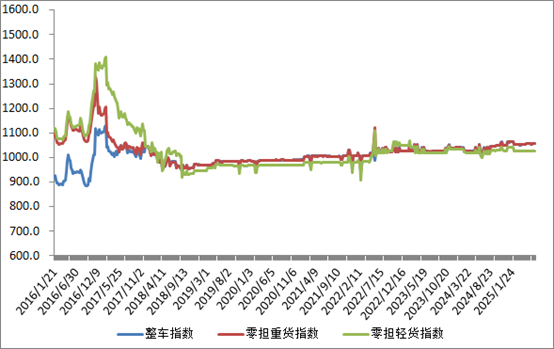 分車型看,各車型指數環比走勢分化。其中,整車指數為1056.50點,比上周回落0.03%;零擔輕貨指數為1026.15點,比上周回升0.03%;零擔重貨指數為1057.19點,比上周回升0.07%。