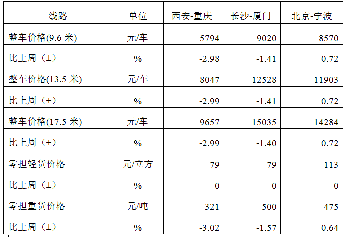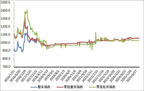 分車型看,各車型指數環比漲跌互現。其中,整車指數為1057.09點,比上周回落0.05%;零擔輕貨指數為1026.13點,比上周回升0.03%;零擔重貨指數為1056.78點,比上周回落0.17%。
