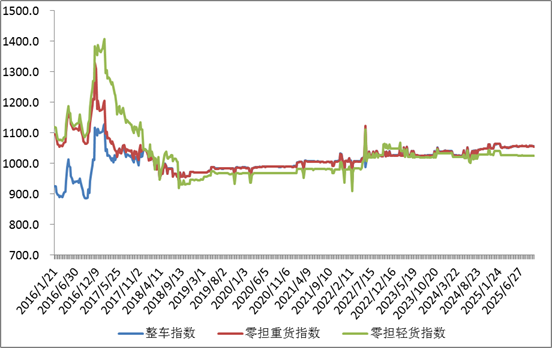 分車型看,各車型指數(shù)環(huán)比總體回落。其中,整車指數(shù)為1055.89點,比上周回落0.12%;零擔輕貨指數(shù)為1025.95點,與上周基本持平;零擔重貨指數(shù)為1055.56點,比上周回落0.13%。