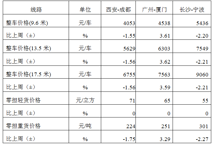 表1 本周部分線路平均價格及環(huán)比情況對比