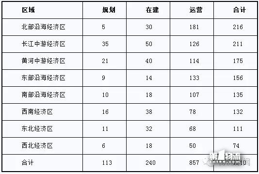 從各經濟區域的實際狀態看,北部沿海經濟區的物流園區數量在八大經濟區中居于首位,黃河中游經濟區的物流園區數量在近三年中迅速增加,排名第三,而長江中游經濟區與黃河中游經濟區在規劃、在建園區數量分別位居前兩位。如下表所示。我們認為,絲綢之路經濟帶和長江經濟帶國家戰略的提出對兩個經濟區域的物流園區規劃和建設起到了促進作用。
