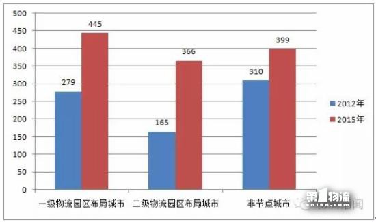 根據《全國物流園區發展規劃(2013—2020年)》,我們對所確定的物流園區布局節點城市進行分析。本次調查顯示,近三年來國家規劃的節點城市物流園區數量增長較快,其中一級物流園區節點城市的園區數量由2012年的279家增長到2015年的445家;二級物流園區節點城市的園區數量從2012年的165家增長到2015年的366家。