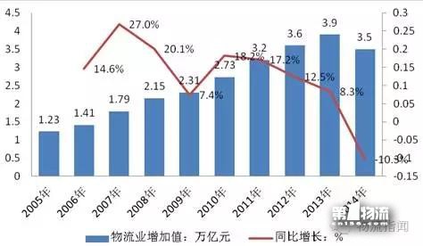 2014年,我國物流業增加值3.5萬億元,可比增長9.5%,保持較快增長,其中,交通運輸業增加值2.4萬億元,可比增長8.3%,貿易物流業增加值6781億元,可比增長7.9%,倉儲業和郵政物流業增加值分別增長4.8%和35.6%。