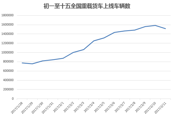 而在元宵團(tuán)圓佳節(jié)當(dāng)天,重載貨車上線數(shù)略有下降,但依然維持在150萬輛的較高水平。預(yù)計元宵節(jié)后,重載貨車運營數(shù)量將繼續(xù)增加,全國重要道路車流量將迎來高峰。