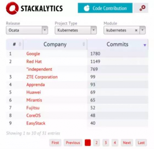 從代碼貢獻排行榜中可以發現,以 OpenStack 平臺為業界所熟悉的 EasyStack(北京易捷思達科技發展有限公司)開始集中發力容器領域,而且選擇了 Kubernetes 容器編排技術。