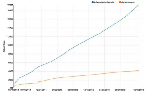 據 GitHub 跟蹤統計,Kubernetes 代碼貢獻數量超過 Mesos 三倍以上;另一方面,在 GitHub Star 的熱度對比圖中, Kubernetes 也遠超 Swarm。