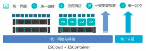 ESContainer 面向企業級容器化應用的管理和編排場景,產品提供包括自動化部署、強化的管理界面、應用商店,多級監控、支持虛擬機、可視化編排、物理機資源池的混合部署,并且與EasyStack的企業級 OpenStack 平臺 ESCloud 深度整合融合,無縫的可視化使用 ESCloudIaaS 提供的計算、網絡和存儲資源以及豐富的軟件基礎設施,為云計算數據中心從以資源為中心到以應用為中心打通了最后一公里。