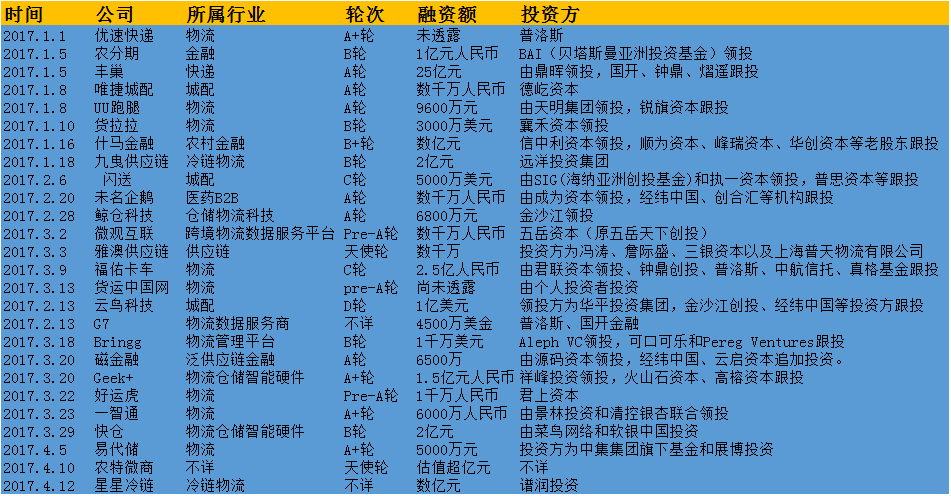 2017年第一季度物流投融資事件梳理