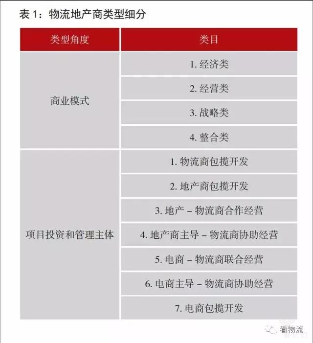 從物流地產商商業模式類型理論的視角,中國房地產企業正處于經濟類向經營戰略類轉型階段。從物流地產商項目投資和管理主體的視角,物流地產商主要分為:物流商包攬開發、地產-物流商合作經營、地產商包攬開發、地產商主導-物流商協助經營、電商-物流商聯合經營、電商主導-物流商協助經營、電商包攬開發,見表1。