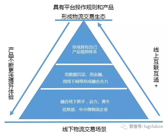 其實我們在觀察過去三年里面的物流平臺,我們會發現就是一個三角形,等邊三角形,用兩個指點加上產品形成等邊,逐級進行整合的過程。