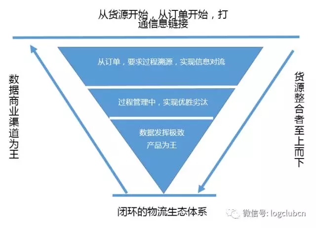 從貨源端入手,從信息對接入口,從訂單開始,要求信息鏈接,要求整個交易場景可視化,要求涉及的倉儲必須可視,形成一個大平臺的開放與協同,完全的打破了物流平臺從下至上的過程,形成了強大的數據沉淀,發揮了數據的極致,打造了渠道為王,產品為王的生態王國。