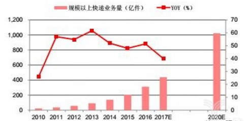 預計2017年我國快遞業務量將達到438億件,日均1.2億單;2020年日單將在2.8億左右,快遞業務完成總量不低于1022億單,2016-2020年的復合增長率高達34.44%。
