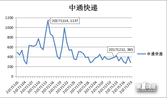 中通“雙11”期間出現(xiàn)明顯峰值,峰值出現(xiàn)在11月14日,“雙11”結(jié)束后的第三天,傳播熱點(diǎn)多以行業(yè)熱點(diǎn)提及中通為主。