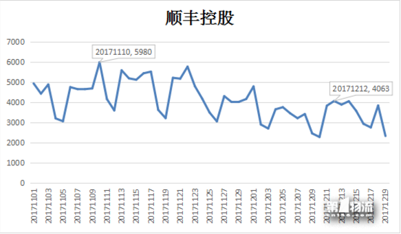 由圖可見,順豐控股從11月1日到12月22日之間的傳播趨勢較為穩(wěn)定。“雙11”、“雙12”對順豐傳播量的沖擊并不是很大,傳播峰值出現(xiàn)在11月10日,雙11”前夜,“‘復(fù)興號’快遞首重70元,‘雙11’當(dāng)天正式上線”為最大熱點(diǎn),該文轉(zhuǎn)發(fā)195次。