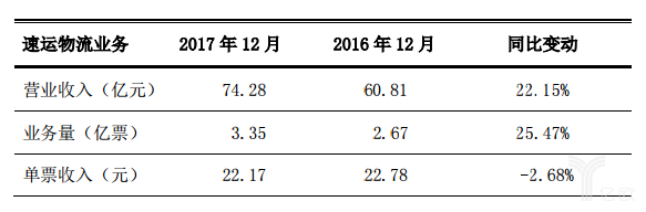 根據順豐控股公告,公司2017年12月速運物流業務營業收入74.28億元,同比增長22.15%;業務量3.35億票,同比增長25.47%;單票收入22.17元,同比減少2.68%。