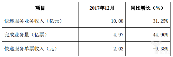 根據韻達股份公告,公司2017年12月快遞服務業務收入10.08億元,同比增長31.25%;完成業務量4.97億票,同比增長44.90%;單票收入2.03元,同比減少9.38%。韻達同時稱隨著公司服務質量提升并依托電子商務領域發展,公司業務量今年顯著增長。
