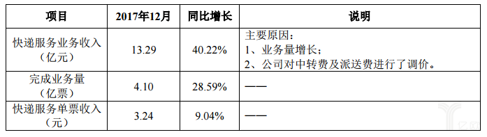 根據申通快遞公告,公司2017年12月快遞服務業務收入13.29億元,同比增長40.22%;完成業務量4.10億票,同比增長28.59%;快遞服務單票收入3.24元,同比增長9.04%。對于業績增長原因,申通表示,公司對中轉費及派送費進行了調價,同時12月份業務量同比也在增長。