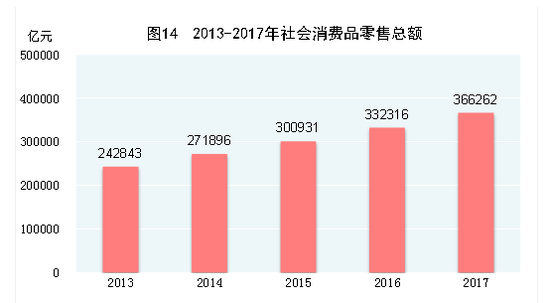 在國內(nèi)貿(mào)易方面,全年社會消費品零售總額366262億元,比上年增長10.2%。按經(jīng)營地統(tǒng)計,城鎮(zhèn)消費品零售額314290億元,增長10.0%;鄉(xiāng)村消費品零售額51972億元,增長11.8%。按消費類型統(tǒng)計,商品零售額326618億元,增長10.2%;餐飲收入額39644億元,增長10.7%。