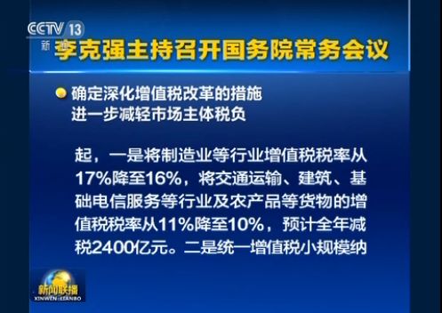 3月28日,國務院召開常務會議決定,從2018年5月1日起,將制造業等行業增值稅稅率從17%降至16%,將交通運輸、建筑、基礎電信服務等行業及農產品等貨物的增值稅稅率從11%降至10%,預計全年可減稅2400億元。