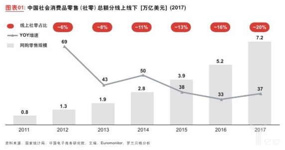 2017年中國(guó)網(wǎng)絡(luò)零售市場(chǎng)交易規(guī)模約為7.2萬(wàn)億元人民幣,同比增速約37%,相較于2015年的約38%、2013年的約43%及2011年約69%,電商增速連續(xù)放緩,出現(xiàn)行業(yè)性趨緩態(tài)勢(shì),這意味著中國(guó)電商依靠流量紅利獲得持續(xù)性高速增長(zhǎng)已非易事,預(yù)計(jì)未來(lái)將過(guò)渡到每年約20-30%的復(fù)合增長(zhǎng)速度。
