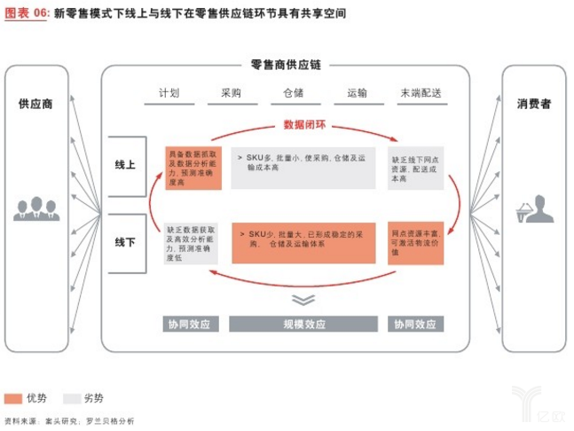 另一方面,線上零售商SKU(存儲(chǔ)單元)多、訂單分散,而線下零售商SKU有限、規(guī)模化程度高,因此,雙方在供應(yīng)鏈中間的采購(gòu)、倉(cāng)儲(chǔ)及運(yùn)輸環(huán)節(jié)的核心資源共享將帶來(lái)可觀的規(guī)模效應(yīng)。