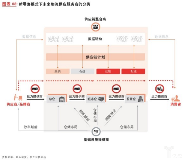 三類玩家將在新零售下的供應(yīng)鏈環(huán)節(jié)中各自承擔(dān)更為清晰的任務(wù)分工。首先,供應(yīng)鏈整合商在前端與消費(fèi)者距離最近,在數(shù)據(jù)抓取上具備天然優(yōu)勢(shì),可以提供準(zhǔn)確且具前瞻性的供應(yīng)鏈計(jì)劃,同時(shí)對(duì)接后端供應(yīng)鏈各物流執(zhí)行環(huán)節(jié)的利益相關(guān)方并提供指導(dǎo)。進(jìn)而,運(yùn)力供應(yīng)商逐步回歸自身在運(yùn)輸、倉(cāng)儲(chǔ)及物流科技應(yīng)用環(huán)節(jié)上的專長(zhǎng),聚焦物流運(yùn)營(yíng)效率的提升。