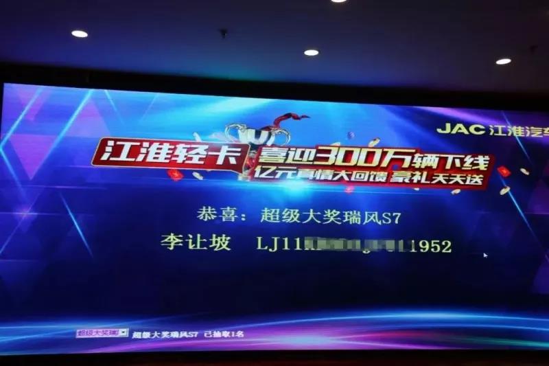 通過(guò)各方驗(yàn)證,李讓坡這才確認(rèn),他真的中了一輛江淮瑞風(fēng)S7。7月14日,江淮輕卡喜迎300萬(wàn)輛下線(xiàn)真情回饋活動(dòng)進(jìn)行了第一輪抽獎(jiǎng),江淮輕卡用戶(hù)李讓坡喜中全國(guó)第一輛瑞風(fēng)S7超級(jí)大獎(jiǎng),同時(shí)抽出的還有三名徽州游特色獎(jiǎng)。